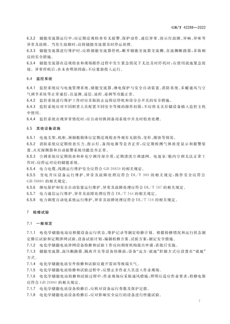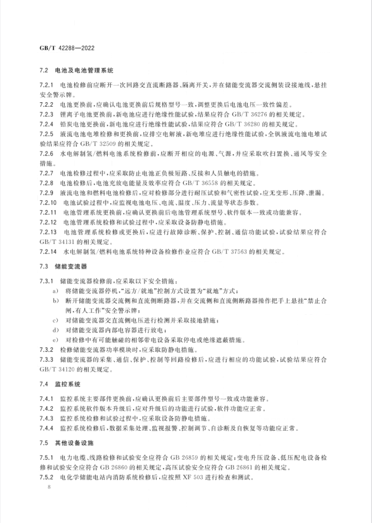 文件適用于鋰離子電池、鉛酸(炭)電池、液流電池、水電解制氫/燃料電池儲能電站。該標(biāo)準(zhǔn)規(guī)定了電化學(xué)儲能電站設(shè)備設(shè)施安全技術(shù)要求、運(yùn)行、維護(hù)、檢修、試驗(yàn)等方面的安全要求,涉及儲能電池、BMS、PCS、監(jiān)控、消防等各類設(shè)備的檢修規(guī)定。