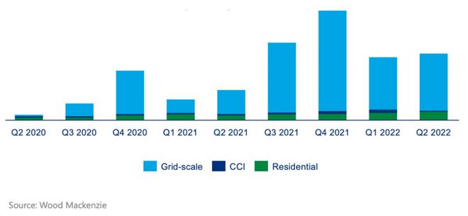 2020年及2021年美國儲能裝機量分別達到3529/10499MW,增長率237%/198%。根據(jù)WoodMackenzie與美國清潔能源協(xié)會聯(lián)合發(fā)布的研究報告顯示,2022年上半年,美國儲能市場裝機容量2305MW/5917MWh,其中22Q2電網(wǎng)級儲能安裝容量達到1,170 MW/2,608 MWh, 是有史以來第二季度的最高裝機容量 。