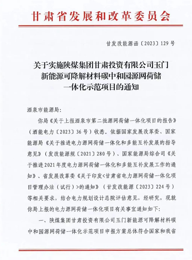 近日,從甘肅省發(fā)改委傳來(lái)喜訊,由陜煤集團(tuán)甘肅投資有限公司(以下簡(jiǎn)稱:甘肅投資公司)申報(bào)的“玉門(mén)新能源可降解材料碳中和產(chǎn)業(yè)園源網(wǎng)荷儲(chǔ)一體化項(xiàng)目”獲批,標(biāo)志著全國(guó)最大、陜煤集團(tuán)“十四五”發(fā)展規(guī)劃首批、甘肅投資公司首個(gè)源網(wǎng)荷儲(chǔ)一體化項(xiàng)目正式落地。