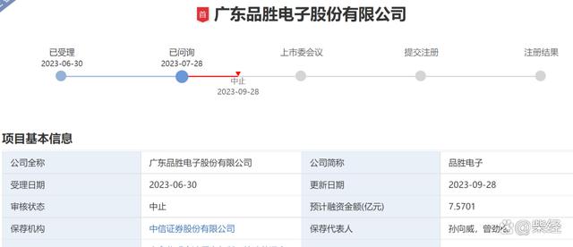 9月28日,深交所官網(wǎng)顯示,廣東品勝電子股份有限公司(以下簡稱“品勝電子”)因更新財(cái)務(wù)資料中止IPO。儲(chǔ)能早知道注意到,品勝電子于6月30日獲深交所受理,并首次披露招股書申報(bào)稿,于7月28日通過深交所下發(fā)第一次審核問詢函。