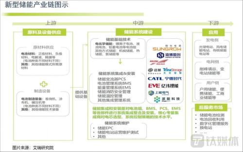根據(jù)艾瑞研究院的梳理,儲能產(chǎn)業(yè)鏈的上游主要是電池材料的原材料供應(yīng)商和制造商;中游則是系統(tǒng)建設(shè)環(huán)節(jié),包括基礎(chǔ)技術(shù)、系統(tǒng)集成安裝和系統(tǒng)運(yùn)維三大部分,市場中最知名的寧德時(shí)代、億鋰緯能、陽光電源、天合光能等都處于中游;下游則是發(fā)電側(cè)、電網(wǎng)側(cè)、用戶側(cè)的應(yīng)用及服務(wù)。