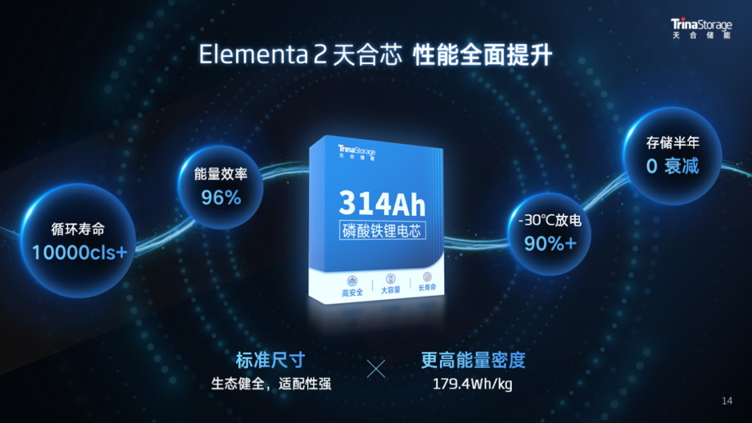 通過優(yōu)化電芯結(jié)構(gòu)和智造工藝,天合自研高安全、高能量密度的314Ah儲能專用電芯,循環(huán)壽命可達(dá)10000cls+,能量密度179.4Wh/kg,能量效率高達(dá)96%,同時采用主流標(biāo)準(zhǔn)的71173尺寸,完美適配當(dāng)前主流系統(tǒng)集成方案,實現(xiàn)同尺寸下系統(tǒng)能量的顯著提升。