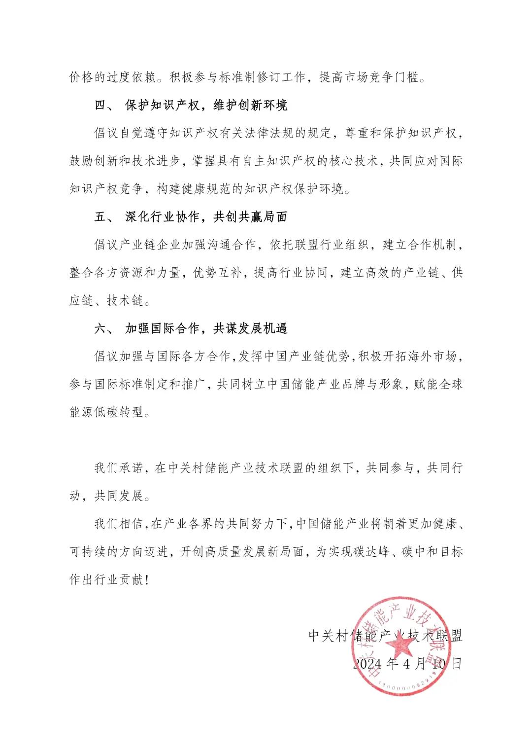 為打造新質(zhì)生產(chǎn)力,營(yíng)造良好的市場(chǎng)環(huán)境,進(jìn)一步推動(dòng)中國(guó)儲(chǔ)能產(chǎn)業(yè)高質(zhì)量發(fā)展,中關(guān)村儲(chǔ)能產(chǎn)業(yè)技術(shù)聯(lián)盟聯(lián)合儲(chǔ)能產(chǎn)業(yè)各方共同發(fā)出“中國(guó)儲(chǔ)能產(chǎn)業(yè)高質(zhì)量發(fā)展倡議 ”。倡議包括強(qiáng)化安全意識(shí),保證產(chǎn)品質(zhì)量;加強(qiáng)行業(yè)自律,構(gòu)建良性競(jìng)爭(zhēng);加快技術(shù)創(chuàng)新,提升核心競(jìng)爭(zhēng)力;保護(hù)知識(shí)產(chǎn)權(quán),維護(hù)創(chuàng)新環(huán)境;深化行業(yè)協(xié)作,共創(chuàng)共贏局面;加強(qiáng)國(guó)際合作,共謀發(fā)展機(jī)遇六點(diǎn)倡議。