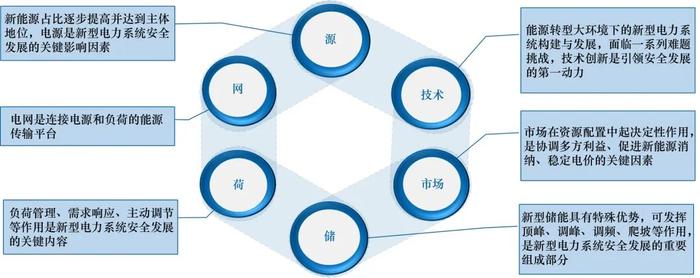新型電力系統(tǒng)是實現(xiàn)“雙碳”目標、重塑能源安全格局的重要載體,構(gòu)建新型電力系統(tǒng)是提高能源安全韌性的根本性舉措。新型電力系統(tǒng)的安全發(fā)展主要受到源、網(wǎng)、荷、儲、市場、技術(shù)六大因素的綜合影響(見圖1)。