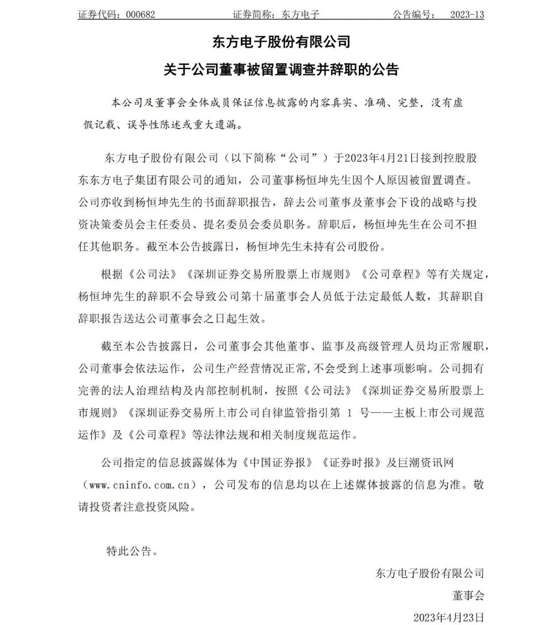 東方電子集團(tuán)所屬上市公司東方電子4月23日晚間公告稱(chēng),公司董事楊恒坤先生因個(gè)人原因被留置調(diào)查。