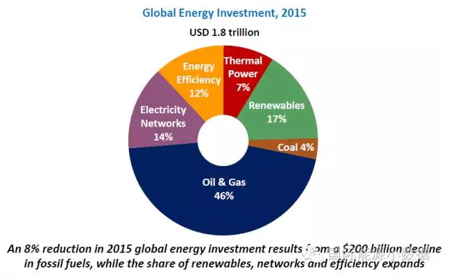 雖說(shuō)油氣投資大幅下降,但是在全球1.83萬(wàn)億的能源投資總額中,油氣投資占比達(dá)到46%??稍偕茉赐顿Y占17%;火電發(fā)電廠投資占7%,電力輸配網(wǎng)投資占14%;能效投資占12%;煤炭開采和運(yùn)輸投資僅占4%。