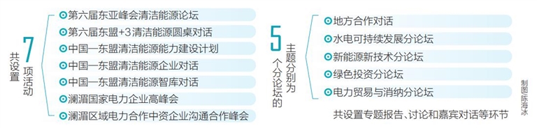 本次中國—東盟清潔能源合作周以“跨越山海 共享未來”為主題,活動期間將舉辦第六屆東亞峰會清潔能源論壇、第六屆東盟+3清潔能源圓桌對話、中國—東盟清潔能源能力建設(shè)計劃、中國—東盟清潔能源企業(yè)對話、中國—東盟清潔能源智庫對話、瀾湄國家電力企業(yè)高峰會、瀾湄區(qū)域電力合作中資企業(yè)溝通合作峰會等7項活動。5場分論壇的主題分別為“地方合作對話”“水電可持續(xù)發(fā)展分論壇”“新能源新技術(shù)分論壇”“綠色投資分論壇”“電力貿(mào)易與消納分論壇”,設(shè)置了專題報告、討論和嘉賓對話等環(huán)節(jié)。