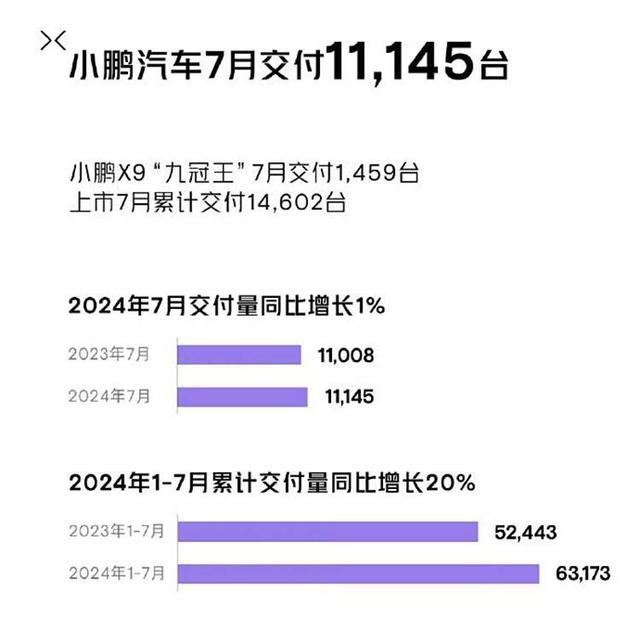 7月小鵬汽車共交付新車11,145臺,同比增長1%,環(huán)比增長4%。1月-7月,小鵬汽車累計交付新車共63,173臺,同比增長20%。