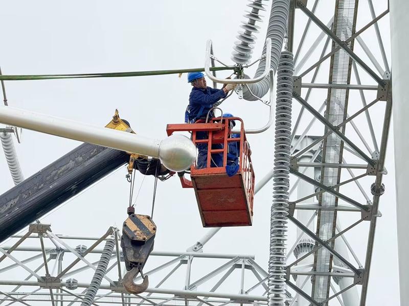 邛崍500千伏變電站內施工人員正在安裝管母線