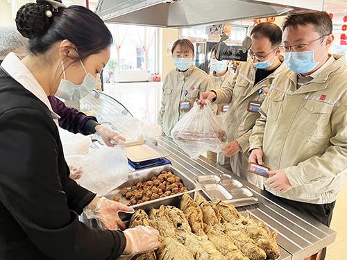 經(jīng)過大廚們精心烹制的色、香、味集于一身的各種熟食,深受職工的喜愛,供不應(yīng)求,剛一出鍋就被搶購一空。“今年的魚炸的特別香,昨天買回去兩個(gè)孩子都搶著吃,今天打算再多買幾條”“今年過年不回家了,和爸媽通了視頻電話,他們看到單位條件這么好,心里很放心”“公司為我們準(zhǔn)備了物美價(jià)廉的‘年貨’,雖然今年堅(jiān)守崗位不回家過年,卻讓我們真真切切感受到了家的溫暖,真得很暖心”大伙兒拎著買到的年貨紛紛說道。