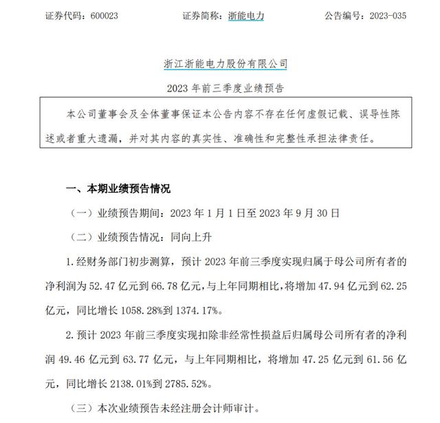 浙能電力稱,經(jīng)財(cái)務(wù)部門(mén)初步測(cè)算,預(yù)計(jì)2023年前三季度實(shí)現(xiàn)歸屬于母公司所有者的凈利潤(rùn)為52.47億元到66.78億元,與上年同期相比,將增加47.94億元到62.25億元,同比增長(zhǎng)1058.28%到1374.17%。預(yù)計(jì)2023年前三季度實(shí)現(xiàn)扣除非經(jīng)常性損益后歸屬母公司所有者的凈利潤(rùn)49.46億元到63.77億元,與上年同期相比,將增加47.25億元到61.56億元,同比增長(zhǎng)2138.01%到2785.52%。