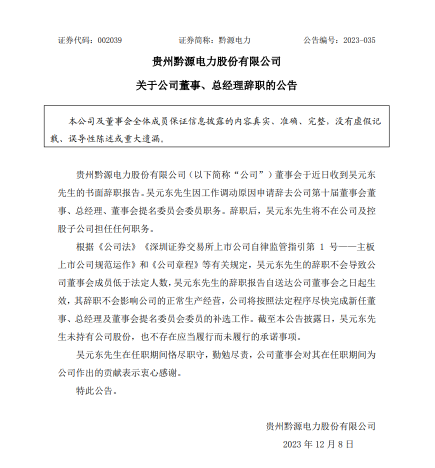 吳元東辭去貴州黔源電力股份有限公司(以下簡稱“黔源電力”)總經(jīng)理等職務(wù)。