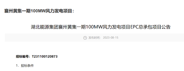 公告顯示,襄州黃集一期100MW風力發(fā)電項目位于湖北省襄陽市襄州區(qū)黃集鎮(zhèn)境內(nèi),裝機規(guī)模100MW,安裝20臺單機容量為5000kW風力發(fā)電機組,擬新建220kV升壓站一座。