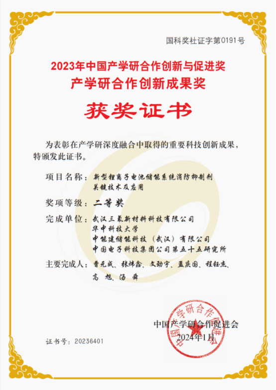 近日,第十五屆中國(guó)產(chǎn)學(xué)研合作創(chuàng)新大會(huì)在北京舉行。中能建儲(chǔ)能科技(武漢)有限公司與武漢三氟新材料科技有限公司、華中科技大學(xué)、中國(guó)電子科技集團(tuán)公司第五十五研究所等單位合作的“新型鋰離子電池儲(chǔ)能系統(tǒng)消防抑制劑關(guān)鍵技術(shù)及應(yīng)用”榮獲2023年中國(guó)產(chǎn)學(xué)研合作創(chuàng)新與促進(jìn)獎(jiǎng)–產(chǎn)學(xué)研合作創(chuàng)新成果獎(jiǎng)二等獎(jiǎng)。