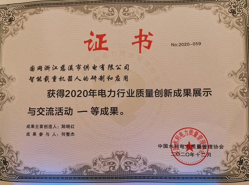 國網(wǎng)慈溪市供電公司智能機器人榮獲全國電力行業(yè)質(zhì)量創(chuàng)新成果一等獎