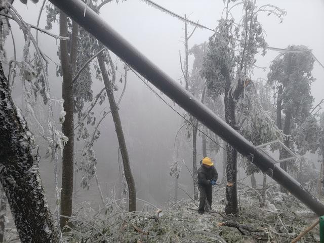為確保景區(qū)供電需求和游客安全,該公司組織30余名黨員干部職工兵分三路,一邊緊急調(diào)集大功率發(fā)電機抬運至景區(qū),第一時間保障該線路用戶可靠供電,一邊協(xié)同云陽國家森林管理局、茶陵縣消防救援大隊緊急開展道路疏通搶險,一邊穿冰簾掃障礙,為搶修斷桿線路做準備。到處是冰碴斷枝的山林里,不斷有晶瑩剔透的冰塊從樹上掉落,搶修人員一邊用柴刀對樹枝進行清理,一邊爬冰臥雪艱難前行,清理道路,運送桿線搶修物資,在零下冰凍的高山上,分秒必爭地投入到搶修中。