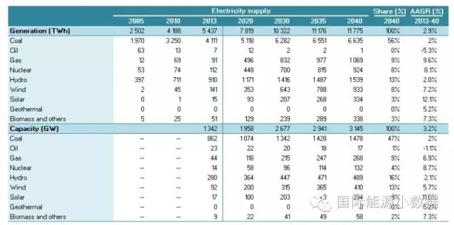 2040 年一次能源供應(yīng)達到46.95億噸標(biāo)油,其中煤炭占51%、石油16%、天然氣13%、核電5%、水電3%、非水可再生能源12%。從發(fā)電量來看,2040年總裝機達3145吉瓦,發(fā)電量達11.78萬億千瓦時,煤電占56%、天然氣發(fā)電9%、核電8%、水電13%、風(fēng)電8%、光伏3%、生物質(zhì) 3%。