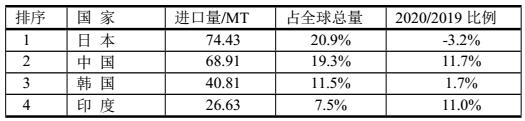 2020年全球LNG進(jìn)口量達(dá)356.12 MT。LNG進(jìn)口最多的前4位國家如表,表明仍然是日本LNG進(jìn)口量最多,但中國LNG進(jìn)口增幅最大的。