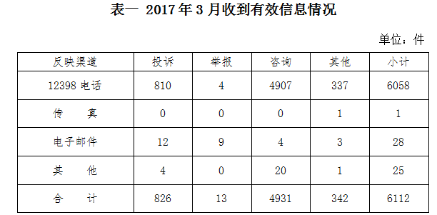 按反映渠道分類,12398電話6058件,傳真1件,電子郵件28件,其他25件。(2017年3月收到有效信息情況見表一)