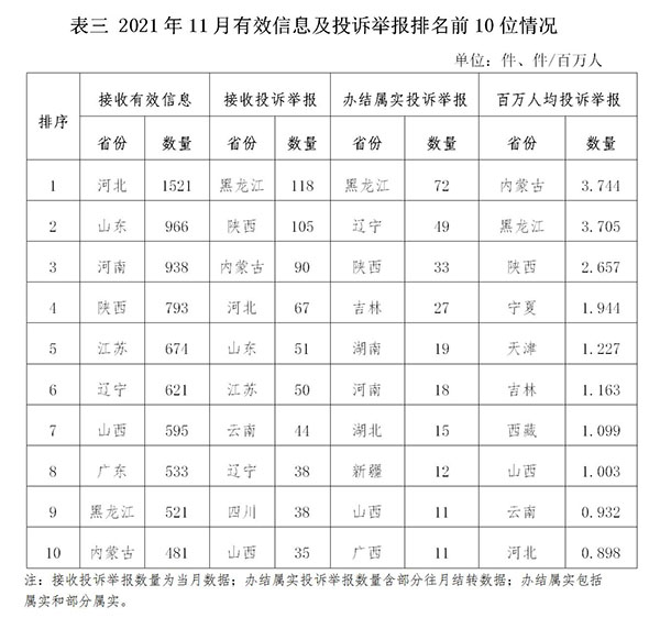 各省(自治區(qū)、直轄市)按照接收的有效信息數(shù)量排序,河北、山東、河南、陜西、江蘇、遼寧、山西、廣東、黑龍江、內(nèi)蒙古排在全國(guó)前10位;按照接收的投訴舉報(bào)數(shù)量排序,黑龍江、陜西、內(nèi)蒙古、河北、山東、江蘇、云南、遼寧、四川、山西排在全國(guó)前10位;按照辦結(jié)屬實(shí)的投訴舉報(bào)數(shù)量排序,黑龍江、遼寧、陜西、吉林、湖南、河南、湖北、新疆、廣西、山西排在全國(guó)前10位;按照百萬(wàn)人均投訴舉報(bào)數(shù)量排序,內(nèi)蒙古、黑龍江、陜西、寧夏、天津、吉林、西藏、山西、云南、河北排在全國(guó)前10位。(2021年11月有效信息及投訴舉報(bào)排名前10位情況見(jiàn)表三)