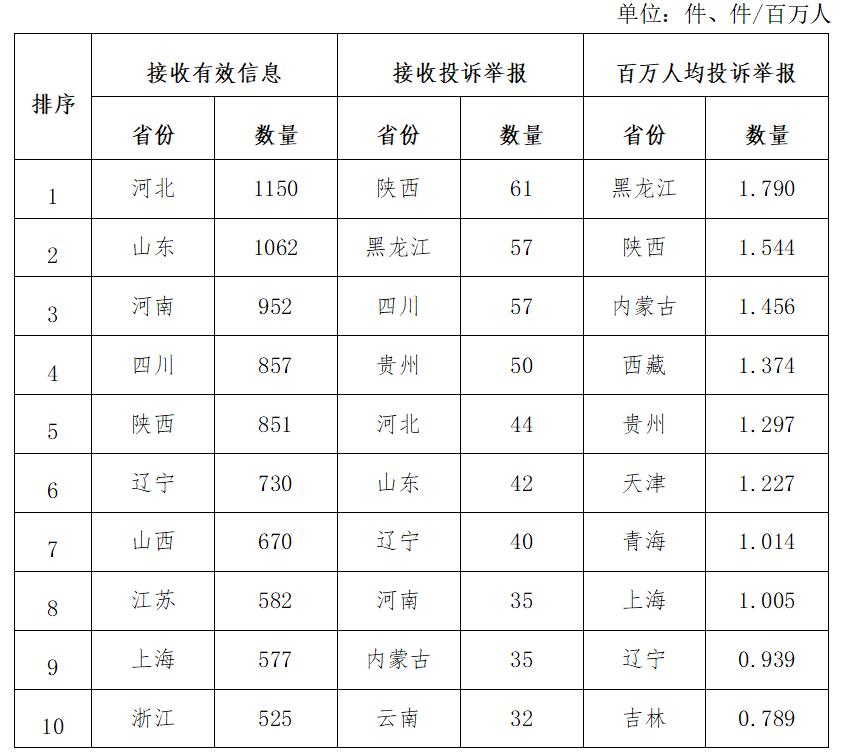 各省(自治區(qū)、直轄市)按照接收的有效信息數(shù)量排序,河北、山東、河南、四川、陜西、遼寧、山西、江蘇、上海、浙江排在全國前10位;按照接收的投訴舉報(bào)數(shù)量排序,陜西、黑龍江、四川、貴州、河北、山東、遼寧、河南、內(nèi)蒙古、云南排在全國前10位;按照百萬人均投訴舉報(bào)數(shù)量排序,黑龍江、陜西、內(nèi)蒙古、西藏、貴州、天津、青海、上海、遼寧、吉林排在全國前10位。(2023年1月有效信息及投訴舉報(bào)排名前10位情況見表三)