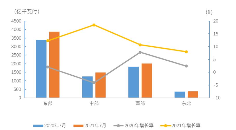 7月份,東、中、西部和東北地區(qū)全社會(huì)用電量增速分別為12.3%、18.5%、10.7%和8.0%。