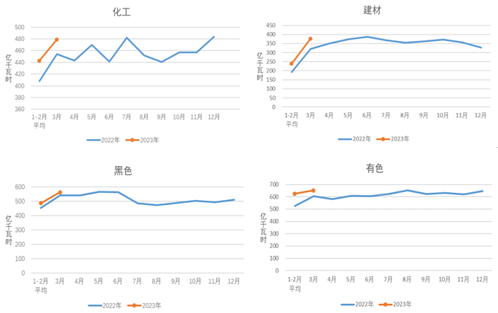 圖4 2022、2023年重點(diǎn)行業(yè)分月用電量情況
