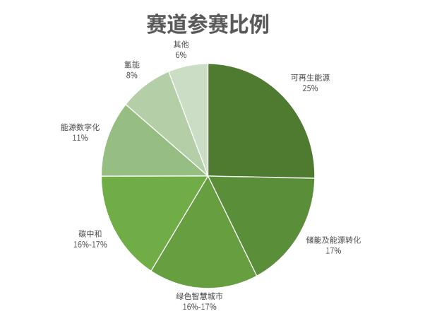 在全球轉(zhuǎn)型非化石能源,以及氣候行動(dòng)加速的大趨勢(shì)下,可再生能源賽道是今年大賽的最熱門(mén)賽道,項(xiàng)目占比25%,緊隨其后的是儲(chǔ)能及能源轉(zhuǎn)化賽道,占比17%。城市是人類(lèi)應(yīng)對(duì)氣候變化最重要的陣地,今年大賽新增綠色智慧城市賽道也受到廣泛關(guān)注,與碳中和賽道勢(shì)均力敵,兩個(gè)賽道占比均在16%-17%之間,能源數(shù)字化賽道占比11%,氫能賽道占比8%。其他創(chuàng)新項(xiàng)目占比6%。