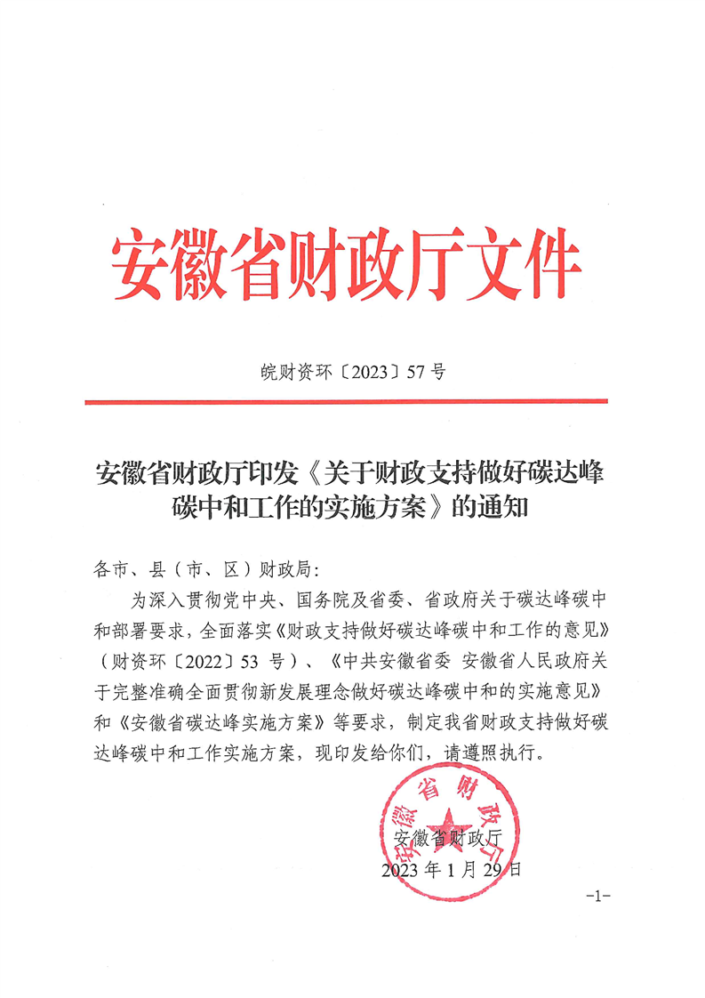 近日,安徽省財政廳印發(fā)《關于財政支持做好碳達峰碳中和工作的實施方案》的通知。