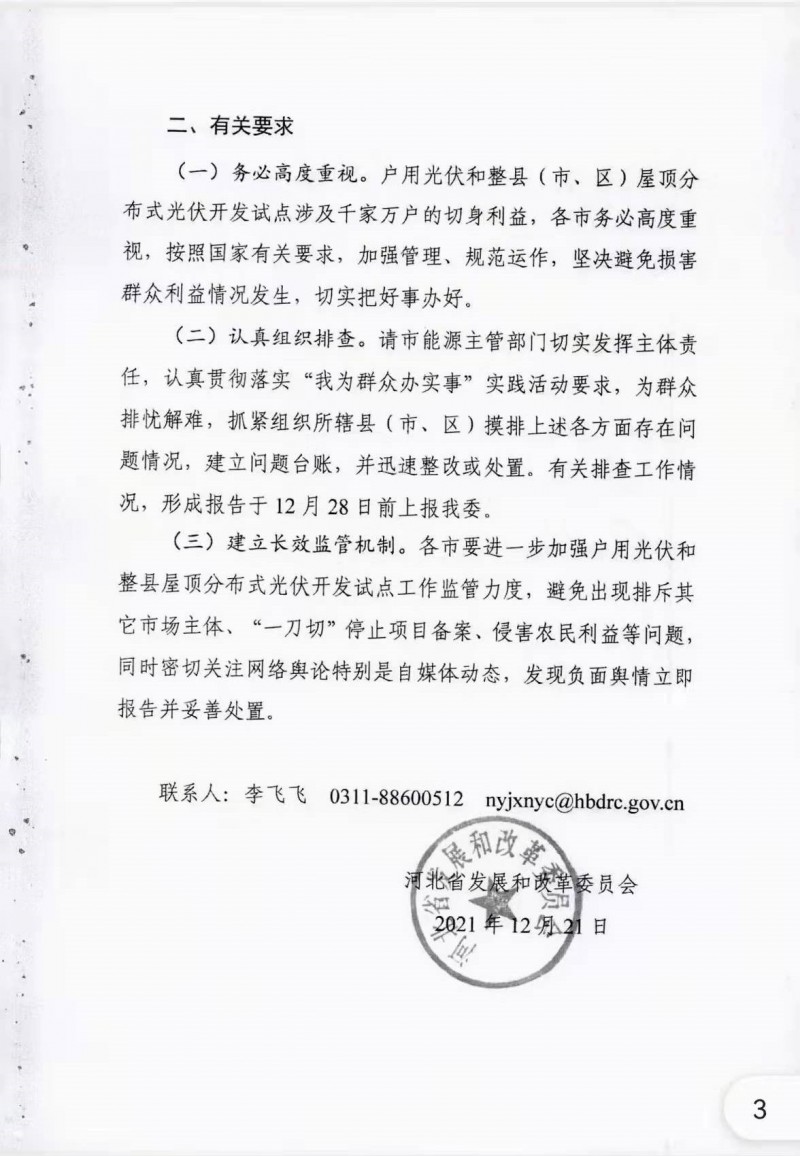 12月21日,河北省發(fā)改委下發(fā)《關(guān)于開展戶用光伏和整縣(市、區(qū))屋頂分布式光伏開發(fā)試點工作問題排查的緊急通知》,文件指出:近期有關(guān)媒體報道多起有關(guān)戶用光伏和整縣(市、區(qū))屋頂分布式光伏開發(fā)試點工作損害群眾利益的事件,引發(fā)社會輿論高度關(guān)注。按照國家發(fā)展改革委、國家能源局安排部署,為進一步規(guī)范戶用光伏和整縣(市、區(qū))屋頂分布式光伏開發(fā)試點工作,開展問題排查工作。有關(guān)排查工作情況,于12月28日上報。