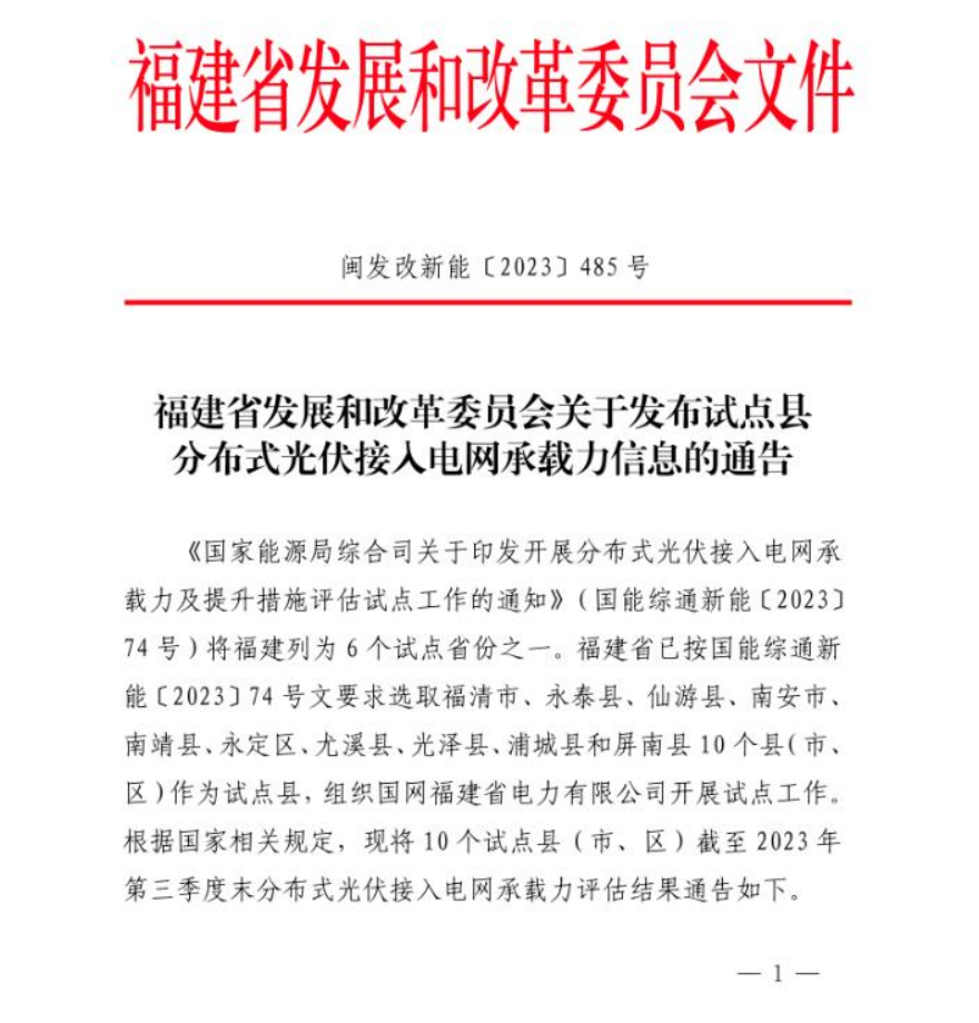 《通告》稱,《國家能源局綜合司關于印發(fā)開展分布式光伏接入電網(wǎng)承載力及提升措施評估試點工作的通知》(國能綜通新能〔2023〕74號)將福建列為6個試點省份之一。按照國能綜通新能〔2023〕74號文要求,福建省選取福清市、永泰縣、仙游縣、南安市、南靖縣、永定區(qū)、尤溪縣、光澤縣、浦城縣和屏南縣10個縣(市、區(qū))作為試點縣,組織國網(wǎng)福建省電力有限公司開展試點工作。