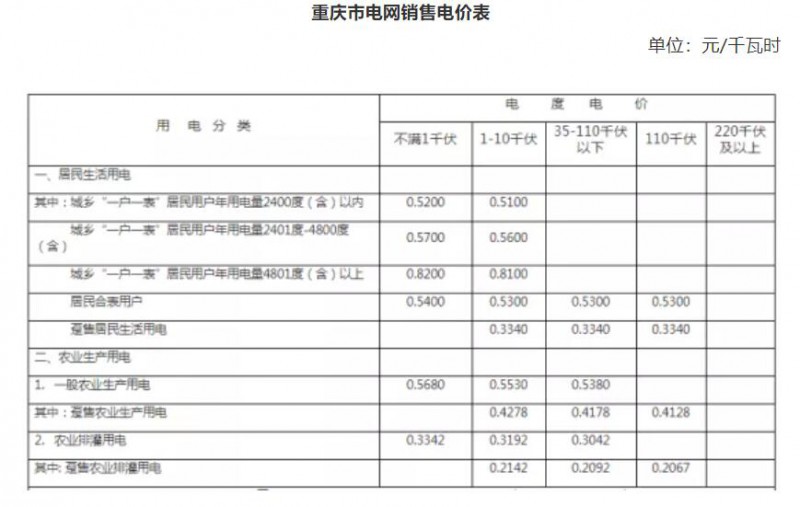 注:1. 上表所列價格,均含國家重大水利工程建設(shè)基金0.196875分錢;除農(nóng)業(yè)排灌用電外(農(nóng)業(yè)排灌用電基金征收按原政策口徑執(zhí)行),均含農(nóng)網(wǎng)還貸資金2分錢;除農(nóng)業(yè)生產(chǎn)用電外,均含大中型水庫移民后期扶持基金0.6225分錢、地方水庫移民后期扶持基金0.05分錢、可再生能源電價附加0.1分錢。2.已摘帽國家級貧困縣農(nóng)業(yè)排灌用電按表列分類電價降低0.196875分錢(國家重大水利工程建設(shè)基金)執(zhí)行。3.國網(wǎng)重慶市電力公司對其控股供電公司躉售電量不適用此表所列躉售價格。