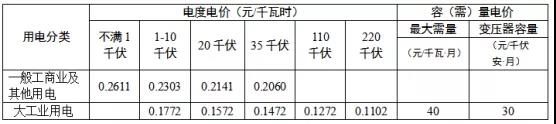 注:1.表中各電價含增值稅、線損、交叉補貼及區(qū)域電網(wǎng)容量電價,不含政府性基金及附加。2.政府性基金及附加標(biāo)準(zhǔn)分別為農(nóng)網(wǎng)還貸資金2分/千瓦時、國家重大水利工程建設(shè)基金0.1125分/千瓦時、可再生能源電價附加1.9分/千瓦時、大中型水庫移民后期扶持基金0.62分/千瓦時。3.110千伏及以上“網(wǎng)對網(wǎng)”外送電省外購電用戶承擔(dān)的送出省平均輸電價格為每千瓦時不超過0.022元(含稅、含線損、下同),最高不超過每千瓦時0.03元。4.變壓器容量在315千伏安及以上的一般工商業(yè)及其他用戶可選擇執(zhí)行表中大工業(yè)生產(chǎn)用電兩部制電價。
