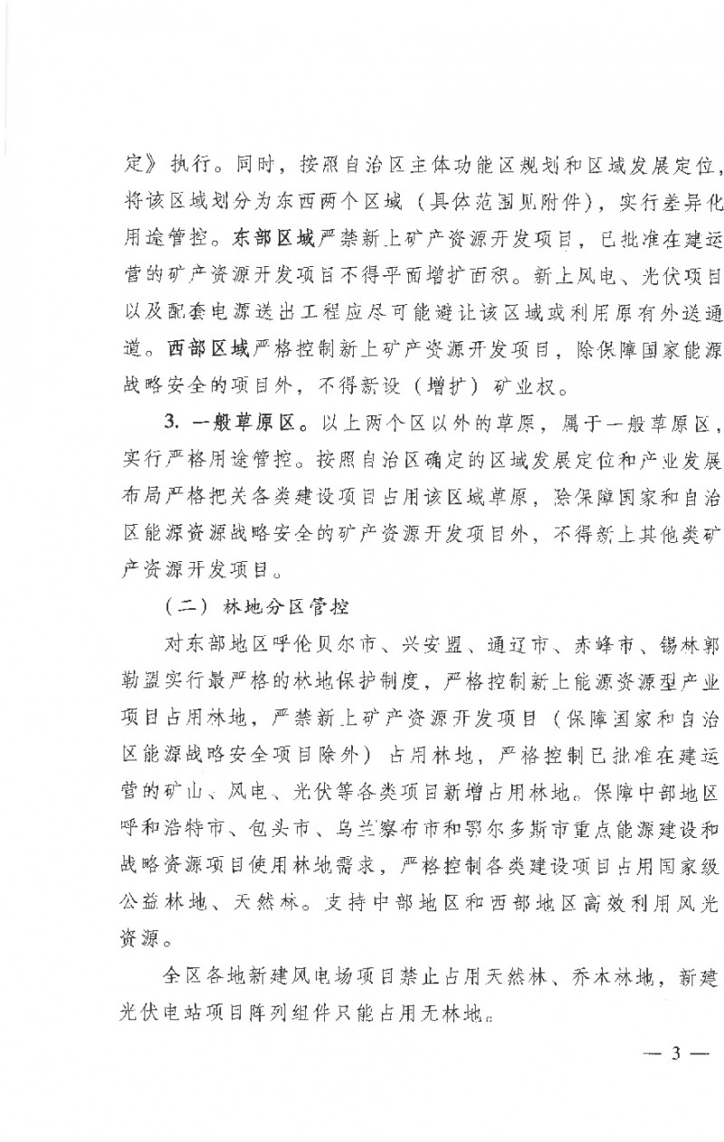 對東部地區(qū)呼倫貝爾市、興安盟、通遼市、赤峰市、錫林郭勒盟實行最嚴(yán)格的林地保護制度,嚴(yán)格控制新上能源資源型產(chǎn)業(yè)項目占用林地,嚴(yán)禁新上礦產(chǎn)資源開發(fā)項目(保障國家和自治區(qū)能源戰(zhàn)略安全項目除外)占用林地,嚴(yán)格控制已批準(zhǔn)在建運營的礦山、風(fēng)電、光伏等各類項目新增占用林地。