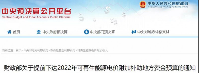 11 月 16日,中央預算公共平臺發(fā)布“關于提前下達2022年可再生能源電價附加補助地方資金預算的通知”。根據(jù)通知,本次下達總計新能源補貼資金38.7億元。其中,風電15.5億元、光伏22.8億元、生物質(zhì)3824萬元。