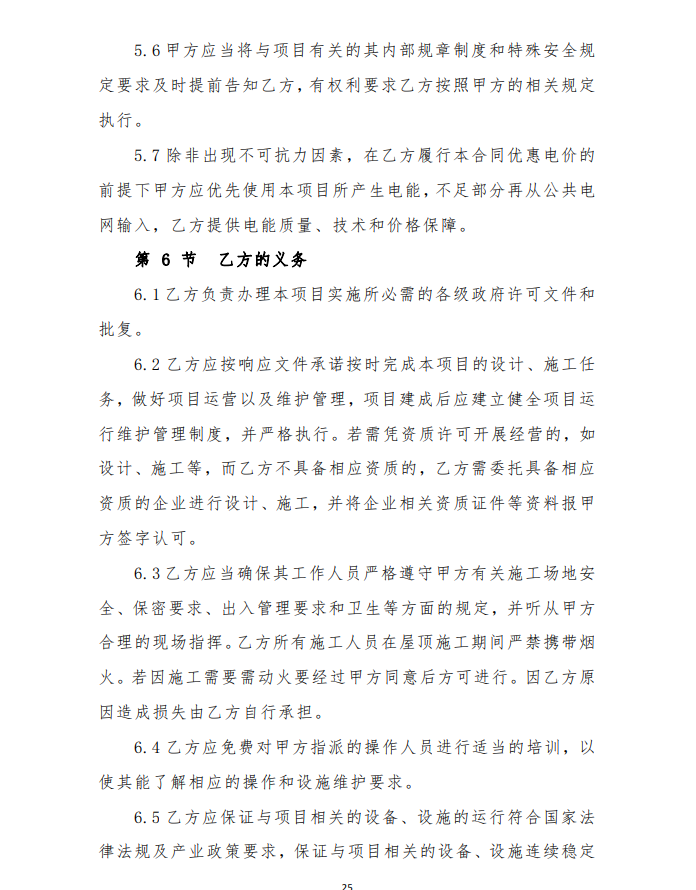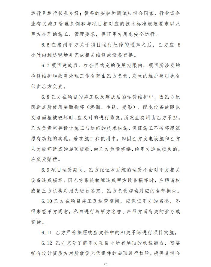 4、由于光伏發(fā)電項(xiàng)目運(yùn)行生命周期長(zhǎng),安裝用戶點(diǎn)多,面大,為保障安裝戶的權(quán)益,維護(hù)社會(huì)穩(wěn)定,建設(shè)企業(yè)要提供明確的長(zhǎng)期運(yùn)維方案及保障費(fèi)用,具體以運(yùn)維合同為準(zhǔn)。