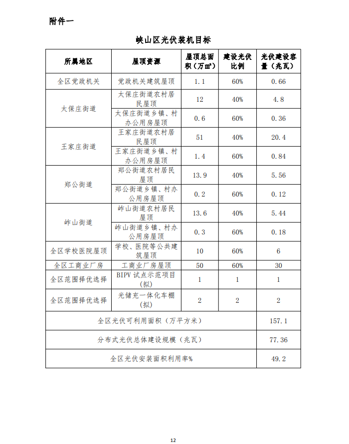 為深入貫徹落實(shí)鄉(xiāng)村振興戰(zhàn)略,努力實(shí)現(xiàn)國(guó)家碳達(dá)峰、碳中和戰(zhàn)略任務(wù),統(tǒng)籌推進(jìn)“源網(wǎng)荷儲(chǔ)-智慧協(xié)同”的分布式光伏建設(shè),打造全國(guó)“雙碳”示范區(qū),根據(jù)峽山區(qū)本地光照條件和屋頂資源情況,結(jié)合國(guó)家能源局政策要求,峽山區(qū)將利用全區(qū)黨政機(jī)關(guān)屋頂 1.1 萬(wàn)平方米,全區(qū)學(xué)校、醫(yī)院等公共建筑屋頂 6 萬(wàn)平方米,全區(qū)工商業(yè)廠房屋頂 30 萬(wàn)平方米,全區(qū)農(nóng)村居民屋頂36.2 萬(wàn)平方米,全區(qū)鄉(xiāng)鎮(zhèn)、村辦公用房屋頂 1.5 萬(wàn)平方米,全區(qū)范圍內(nèi)擇優(yōu)擬建 BIPV 項(xiàng)目面積 1 萬(wàn)平方米,全區(qū)擬建光儲(chǔ)充一體化車棚面積 2 萬(wàn)平方米,實(shí)現(xiàn)分布式光伏新增裝機(jī) 77.36 兆瓦。