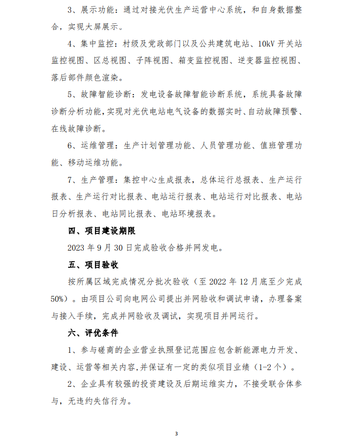 2月9日,山東濰坊峽山區(qū)發(fā)布整縣分布式光伏規(guī)?;_(kāi)發(fā)試點(diǎn)項(xiàng)目競(jìng)爭(zhēng)性磋商二次公告,要求2023 年 9 月 30 日完成驗(yàn)收合格并網(wǎng)發(fā)電,按所屬區(qū)域完成情況分批次驗(yàn)收(至 2022 年 12 月底至少完成50%)。由項(xiàng)目公司向電網(wǎng)公司提出并網(wǎng)驗(yàn)收和調(diào)試申請(qǐng),辦理備案與接入手續(xù),完成并網(wǎng)驗(yàn)收及調(diào)試,實(shí)現(xiàn)項(xiàng)目并網(wǎng)運(yùn)行。至 2023 年底,光伏項(xiàng)目總投資約 4.0946 億元人民幣。