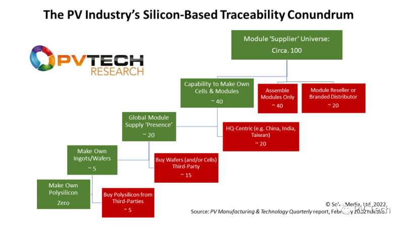 這里的比例大約是20:40:40。這意味著,今天有大約40家公司可以提供組件,其中的關(guān)鍵部件(太陽(yáng)能電池)也是由同一家公司制造的(要么在同一制造廠,要么在不同的地點(diǎn)/地區(qū)/國(guó)家)。