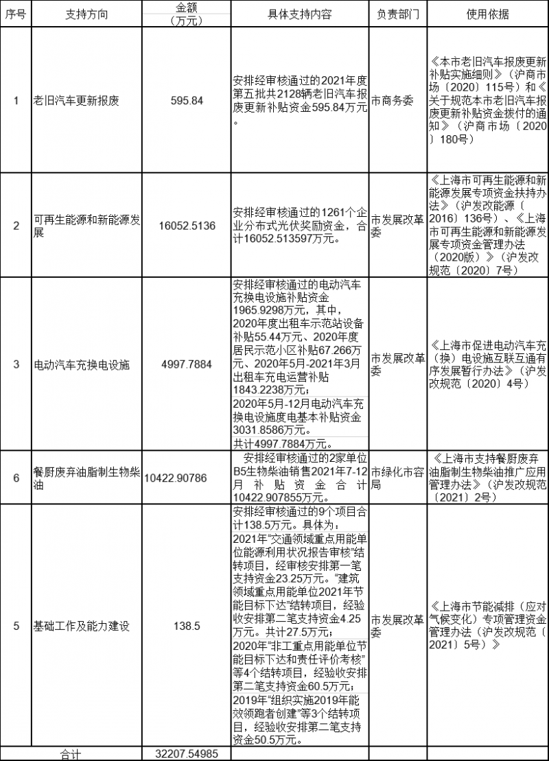 (二)按照《上海市可再生能源和新能源發(fā)展專項資金扶持辦法》(滬發(fā)改能源〔2016〕136號)、《上海市可再生能源和新能源發(fā)展專項資金管理辦法(2020版)》(滬發(fā)改規(guī)范〔2020〕7號)等相關規(guī)定,安排經審核通過的1261個企業(yè)分布式光伏獎勵資金,合計16052.513597萬元。
