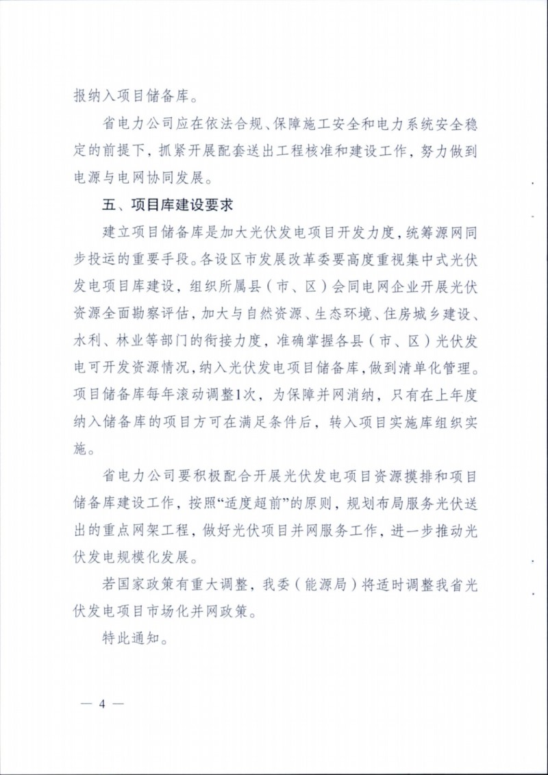 儲備庫項目要及時開展可行性研究和接入系統(tǒng)設計工作,省電力公司要根據(jù)儲備庫項目及時開展整體接網(wǎng)規(guī)劃和研究。實施項目要合理確定并網(wǎng)時間,最晚在2024年12月底并網(wǎng),如有特殊情況可申請延遲半年。省電力公司要按照"適度超前”的原則,規(guī)劃布局服務光伏送出的重點網(wǎng)架工程。