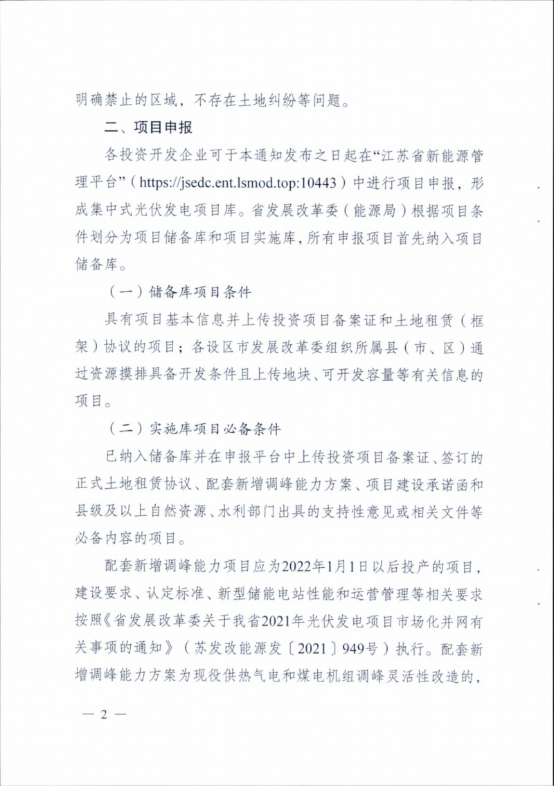 根據(jù)文件,本次申報主要為地面集中式光伏電站,項目應選址明確,不涉及永久基本農(nóng)田、自然保護區(qū)以及無土地糾紛等。投資企業(yè)需在“江蘇省新能源管理平臺”進行申報,形成項目庫,項目庫分為儲備和實施兩種類型。