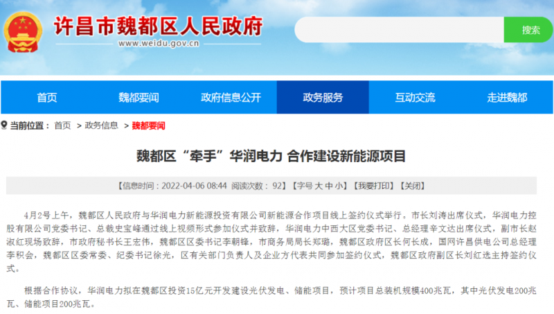 4月2號(hào),河南許昌魏都區(qū)人民政府與華潤(rùn)電力新能源投資有限公司新能源合作項(xiàng)目線上簽約儀式舉行。