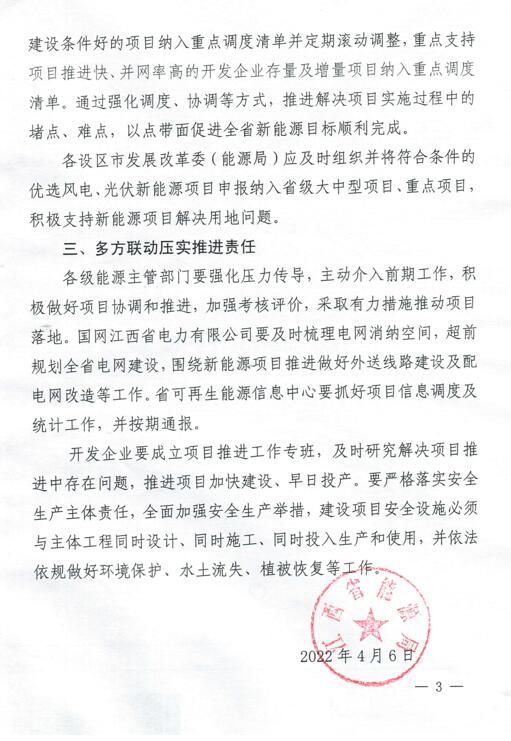 2022年4月6日,江西省能源局就加快我省新能源項目建設有關事項進行了通知,通知包含以下內(nèi)容:1.加快推進新能源項目建設;2.建立重點項目調(diào)度機制;3.多方聯(lián)動壓實推進責任。