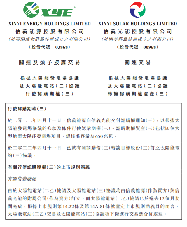 4月11日,信義能源及信義光能聯(lián)合公布公告稱(chēng),于2022年4月11日信義能源向信義光能交付認(rèn)購(gòu)權(quán)通知(三),以根據(jù)太陽(yáng)能發(fā)電場(chǎng)協(xié)議的條款及條件行使認(rèn)購(gòu)期權(quán)(三)。認(rèn)購(gòu)期權(quán)資產(chǎn)(三)包括四個(gè)大型地面太陽(yáng)能發(fā)電場(chǎng)項(xiàng)目,總核準(zhǔn)容量為650兆瓦。