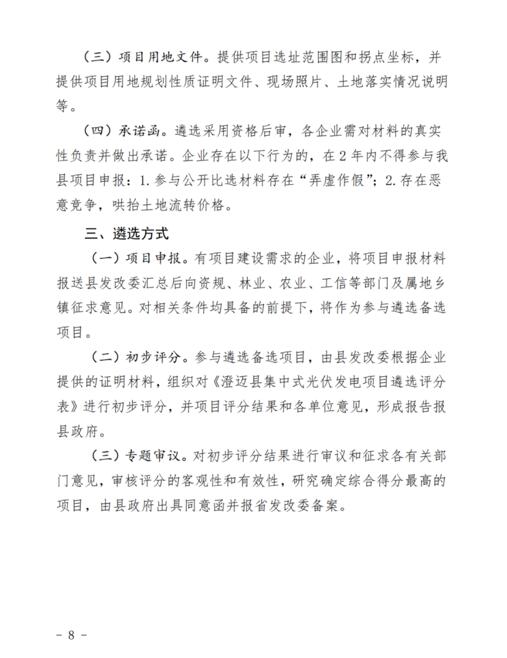 文件規(guī)定了澄邁縣集中式光伏發(fā)電項(xiàng)目應(yīng)納入省內(nèi)“十四五”能源發(fā)展規(guī)劃總規(guī)模,在全縣范圍內(nèi)實(shí)行總量控制,每年新增建設(shè)的集中式光伏發(fā)電項(xiàng)目總規(guī)模原則上不超過10萬千瓦。對(duì)有建設(shè)需求的企業(yè),向縣發(fā)改委集中進(jìn)行申報(bào),通過組織比選的方式遴選綜合評(píng)價(jià)最高的項(xiàng)目實(shí)施。