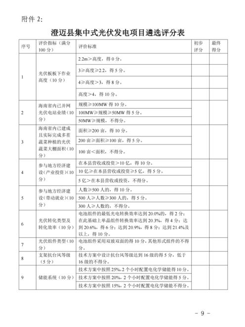 此外,根據(jù)澄邁縣集中式光伏發(fā)電項(xiàng)目遴選評(píng)分表,在澄邁縣營(yíng)收或投資>10億,得10分;10億≥在本縣營(yíng)收或投資≥5億,得5分;5億>在本縣營(yíng)收或投資,不得分。配套儲(chǔ)能系統(tǒng)包括,技術(shù)方案中按照25%,2個(gè)小時(shí)配置電化學(xué)儲(chǔ)能得10分。按照20%,2個(gè)小時(shí)配置電化學(xué)儲(chǔ)能得5分。按照15%,2個(gè)小時(shí)配置電化學(xué)儲(chǔ)能不得分。