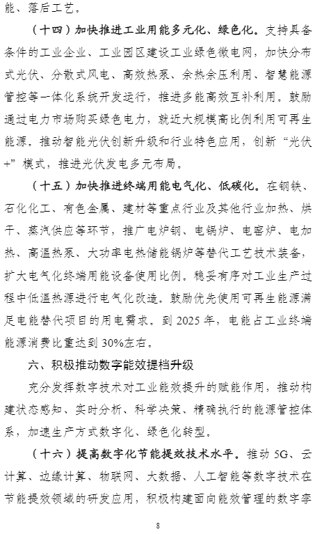 加快推進(jìn)終端用能電氣化、低碳化。在鋼鐵、石化化工、有色金屬、建材等重點(diǎn)行業(yè)及其他行業(yè)加熱、烘干、蒸汽供應(yīng)等環(huán)節(jié),推廣電爐鋼、電鍋爐、電窯爐、電加熱、高溫?zé)岜?、大功率電熱?chǔ)能鍋爐等替代工藝技術(shù)裝備,擴(kuò)大電氣化終端用能設(shè)備使用比例。穩(wěn)妥有序?qū)I(yè)生產(chǎn)過程中低溫?zé)嵩催M(jìn)行電氣化改造。鼓勵(lì)優(yōu)先使用可再生能源滿足電能替代項(xiàng)目的用電需求。到2025年,電能占工業(yè)終端能源消費(fèi)比重達(dá)到30%左右。