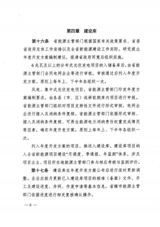 列入年度開發(fā)方案的項(xiàng)目,推送入建設(shè)庫。建設(shè)庫項(xiàng)目納入全省新能源項(xiàng)目建設(shè)“月調(diào)度、季通報(bào)、年監(jiān)測”體系,涉及項(xiàng)目業(yè)主、項(xiàng)目所在地能源主管部門參與相應(yīng)考核與監(jiān)測評價(jià)。