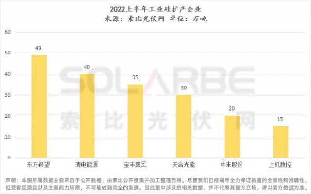 經(jīng)公開信息統(tǒng)計,東方希望、清電能源、寶豐集團、天合光能、中來股份、上機數(shù)控六家企業(yè)上半年共計擴產(chǎn)189萬噸工業(yè)硅,且工業(yè)硅擴產(chǎn)規(guī)模均超出配套多晶硅產(chǎn)量。